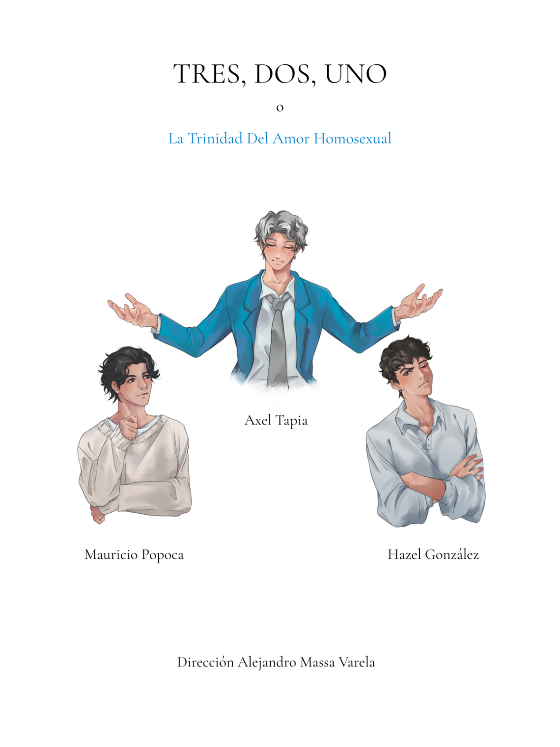 Cuando se considera que la homosexualidad, y la homosexualidad juvenil en particular, “ya no es tema” o es “un tema superado” para los escenarios, el filósofo, dramaturgo y director de escena Alejandro Massa Varela nos ofrece en su texto “Tres, dos, uno o la Trinidad del amor homosexual” una visión que, no por haber sido visitada en otras ocasiones y por otros autores, es menos innovadora y sorprendente.
