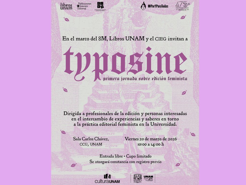 El Centro de Investigaciones y Estudios de Género (CIEG) y la Dirección General de Publicaciones y Fomento Editorial (DGPFE) realizarán Typosine. Primera Jornada sobre Edición Feminista, un encuentro que impulsará la reflexión sobre los desafíos y alcances de la edición con perspectiva de género en los ámbitos cultural y académico.
