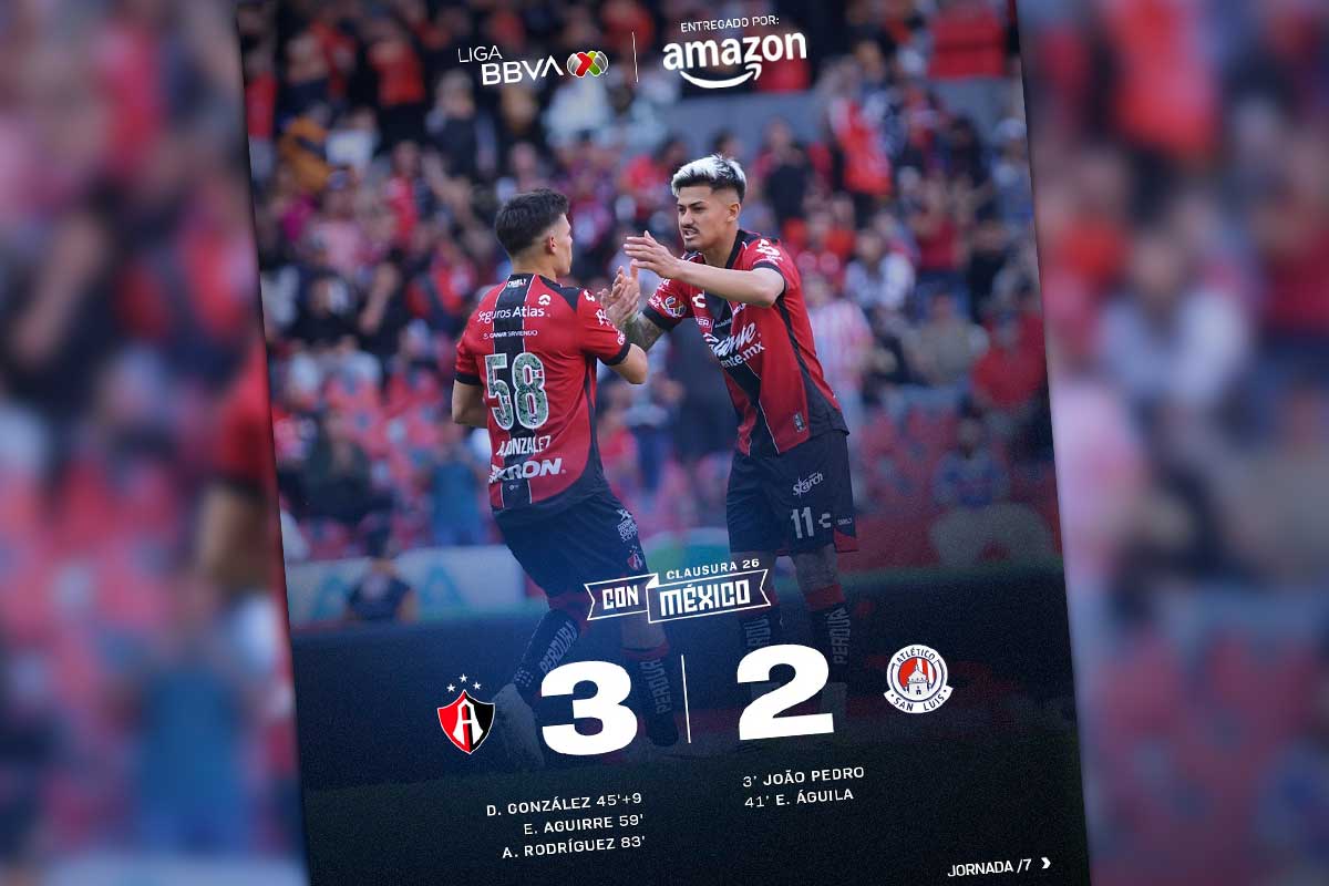 Atlas derrotó 3-2 al Atlético de San Luis este sábado en el Estadio Jalisco, donde firmó espectacular voltereta, al sobreponerse a un 0-2, en partido de la jornada siete del Torneo Clausura 2026 de la Liga MX.