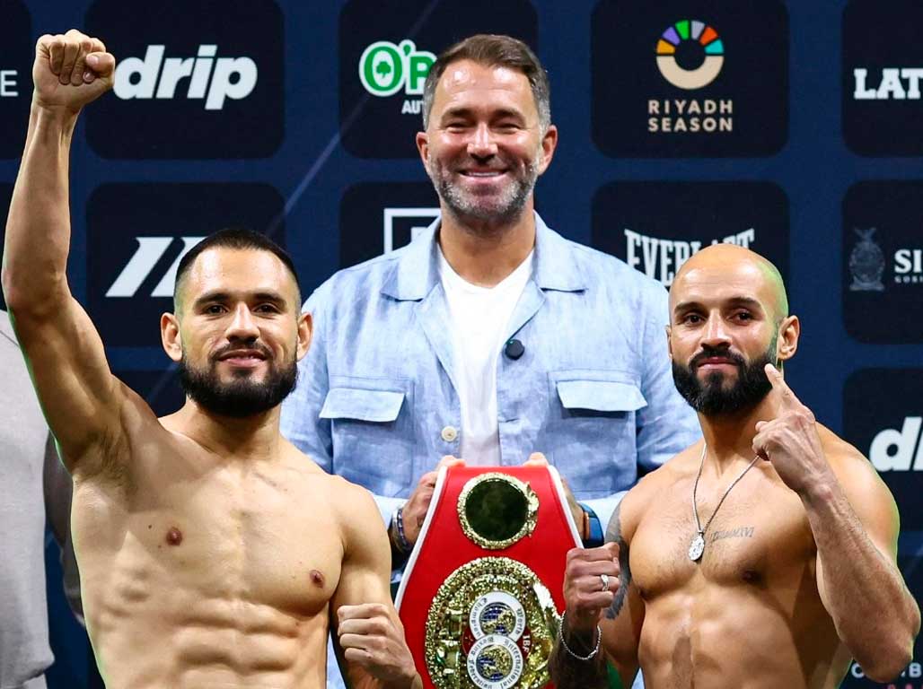Sugar Núñez y Pitufo Díaz disputarán el sábado el título superpluma de la FIB. Foto / Cortesía X @MatchroomBoxing