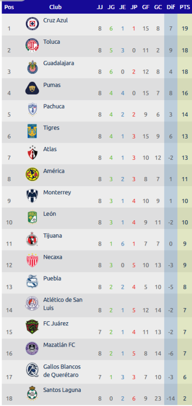 La Máquina de Cruz Azul tiene 19 puntos y es escoltado de Toluca y Chivas, con 18 unidades, y para Guadalajara fue perder el liderato y estar ahora en la tercera plaza.