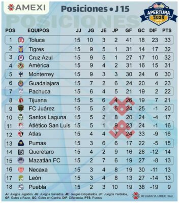 Con 41 goles, Diablos Rojos es el equipo más goleador del torneo, seguido por Tigres y América, con 31; y el que menos anota es León, con 13 goles en 15 partidos.