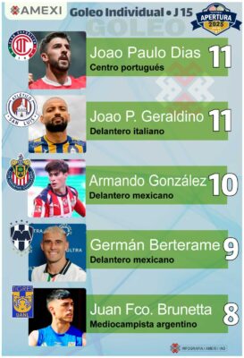 En la tabla de goleo el italiano Joao Pedro (Atlético de San Luis) y el portugués Paulinho (Toluca) comparten la cima con 11 goles.