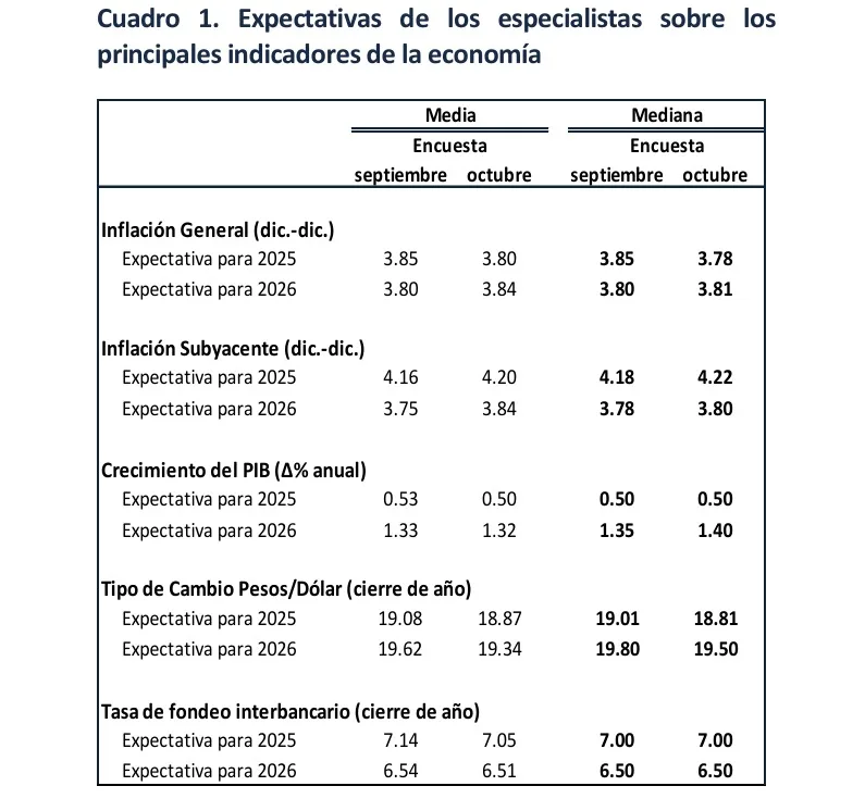 Según la encuesta de octubre sobre las expectativas de los especialistas en economía del sector privado, la proyección de crecimiento del Producto Interno Bruto (PIB) para 2025 se redujo a 0.50%, desde 0.53% en septiembre, tras cuatro meses consecutivos de incrementos.
