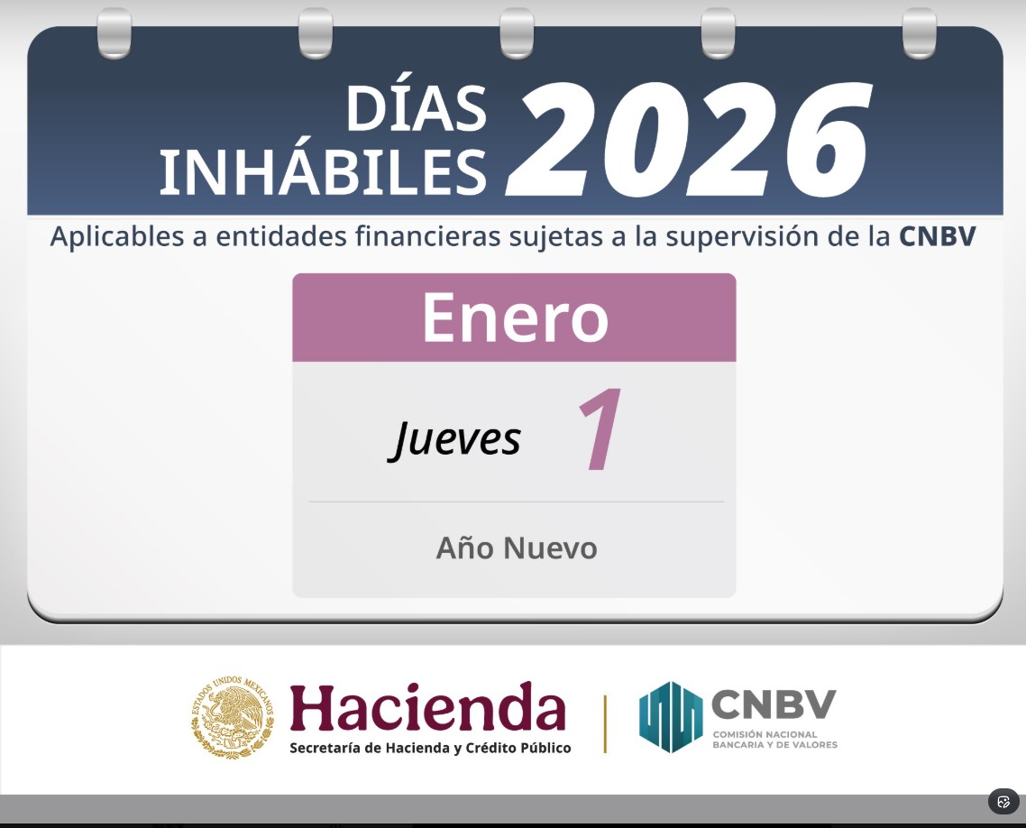 Los bancos en México suspenderán operaciones el jueves 1 de enero de 2026, en cumplimiento con la disposición oficial de la Comisión Nacional Bancaria y de Valores (CNBV), publicada en el Diario Oficial de la Federación el pasado 10 de diciembre.