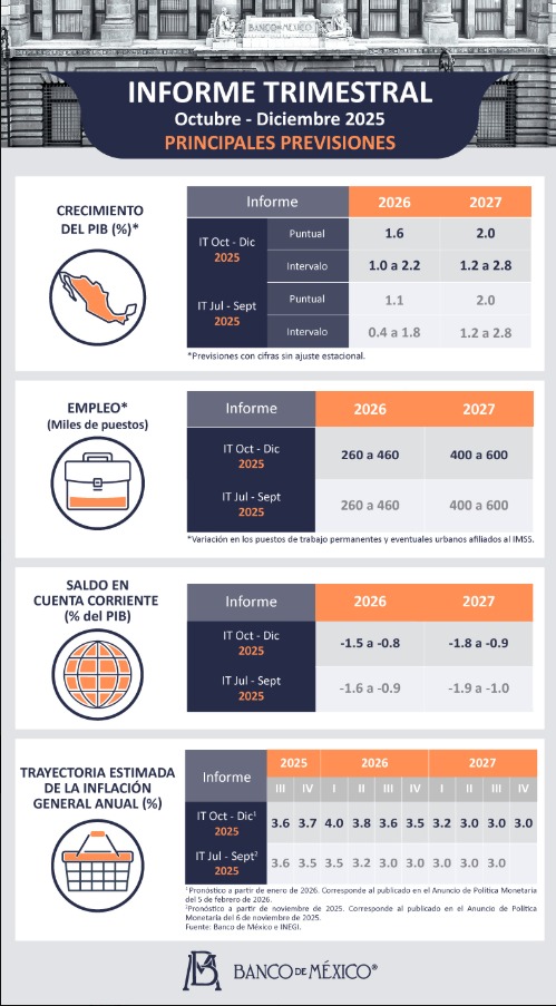 Así, explicó Rodríguez Ceja, la mayor fortaleza económica observada al cierre del año pasado es la razón por la cual el banco central revisó al alza su pronóstico para el crecimiento de 2026 de 1.1% a 1.6 por ciento.