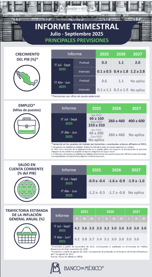 Durante la presentación del Informe Trimestral, julio-septiembre 2025, explicó que, con la nueva información disponible, el intervalo de variación esperada del PIB para 2025 se ajusta a un rango de 0.1 a 0.5%, frente al anterior de 0.1 a 1.1 por ciento.