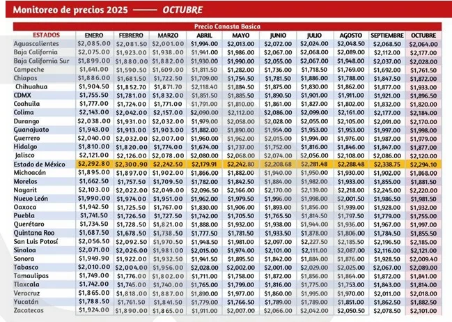 La Alianza Nacional de Pequeños Comerciantes (Anpec) reportó que el precio promedio de la Canasta Básica Alimentaria (CBA) alcanzó los mil 992.21 pesos en octubre del 2025, lo que representa un incremento de 13.06 pesos respecto al mes anterior, es decir, una variación al alza de 0.66 por ciento.