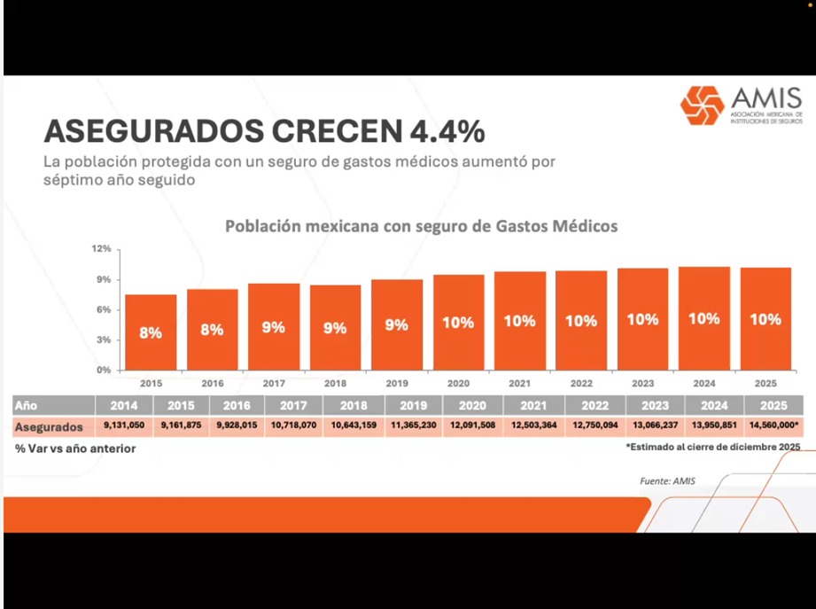 La directora general de la AMIS reportó que, actualmente, 14.5 millones de personas cuentan con seguro de gastos médicos al cierre de diciembre de 2025, lo que representa más del 10% de la población mexicana y un incremento de 4.4% respecto al año previo.