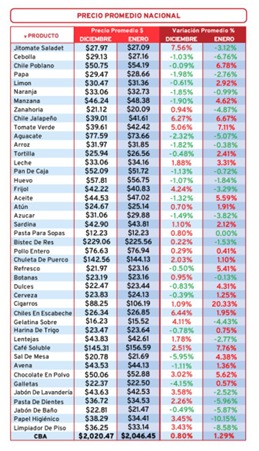 El organismo detalló que el precio promedio de la CBA en enero de 2026 se ubicó en dos 046.45 pesos, frente a los dos mil 020.47 pesos reportados en diciembre de 2025, tras un estudio de mercado realizado en los 32 estados del país con más de 200 puntos de venta en distintos niveles de consumo.