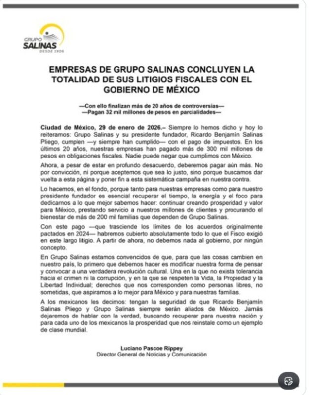 En su cuenta en X, Grupo Salinas confirmó que pagará en parcialidades los 32 mil millones de pesos, con lo cual concluye sus litigios fiscales con el gobierno de México.
