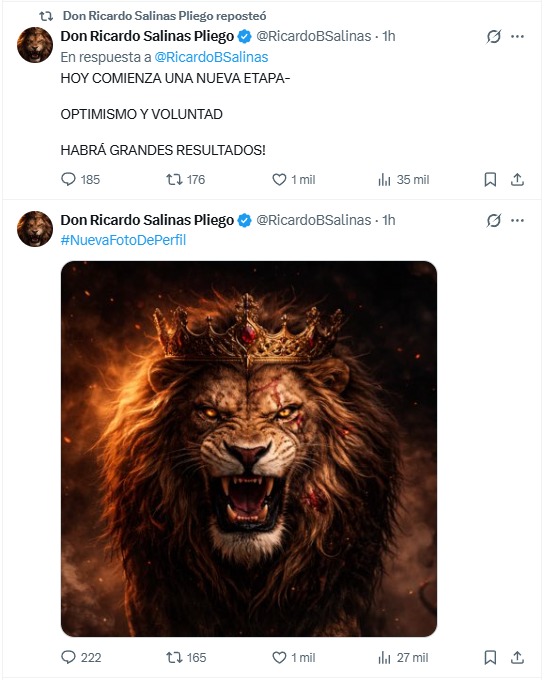 En tanto, el empresario Ricardo Salinas Pliego cambió su foto de perfil en X por la imagen de un león con corona y escribió: