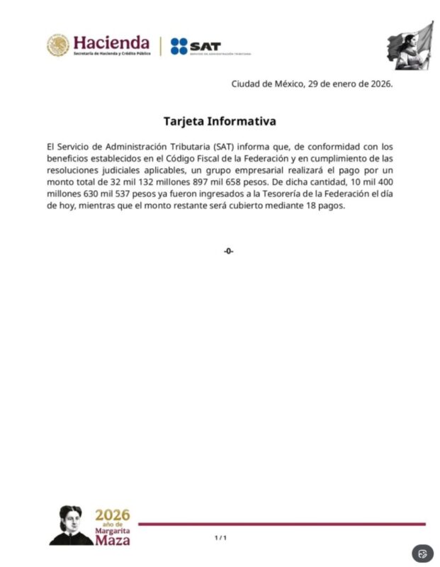 En una breve nota informativa, sin mencionar a Grupo Salinas por su nombre, en apego al secreto fiscal, el organismo recaudador informó que “un grupo empresarial realizará el pago por un monto total de 32 mil 132 millones 897 mil 658 pesos”.
