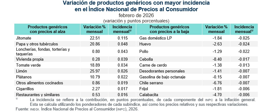 El Índice Nacional de Precios al Consumidor (INPC) aumentó 0.50% mensual, la cifra más alta para un febrero desde 2023 y por arriba de las expectativas (0.43%)