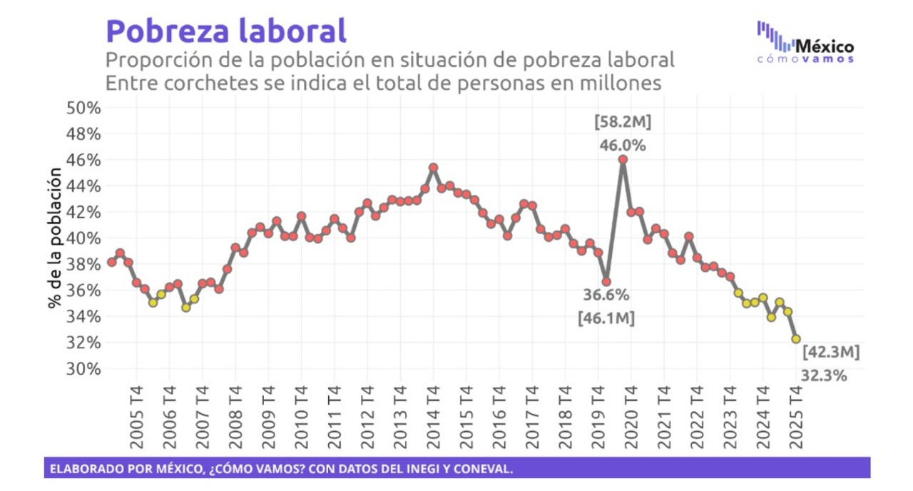 La pobreza laboral en México descendió a su nivel más bajo desde que se tiene registro, al cerrar el cuarto trimestre del 2025 en 32.3% de la población, de acuerdo con cifras del Instituto Nacional de Estadística y Geografía (INEGI).