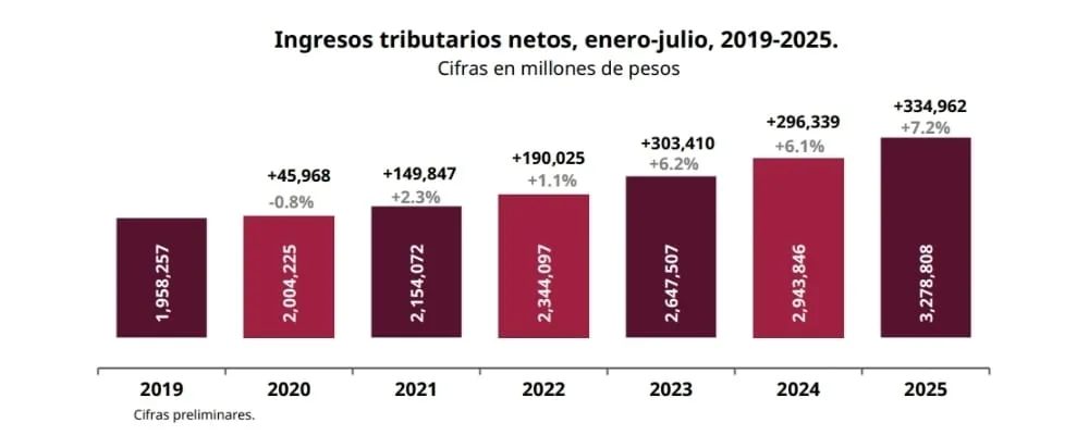 La recaudación tributaria en México registró un crecimiento real de 7.2% anual durante el periodo enero-julio de 2025, al alcanzar un monto de 3.0 billones 278 mil 808 millones de pesos, informó el Servicio de Administración Tributaria (SAT).