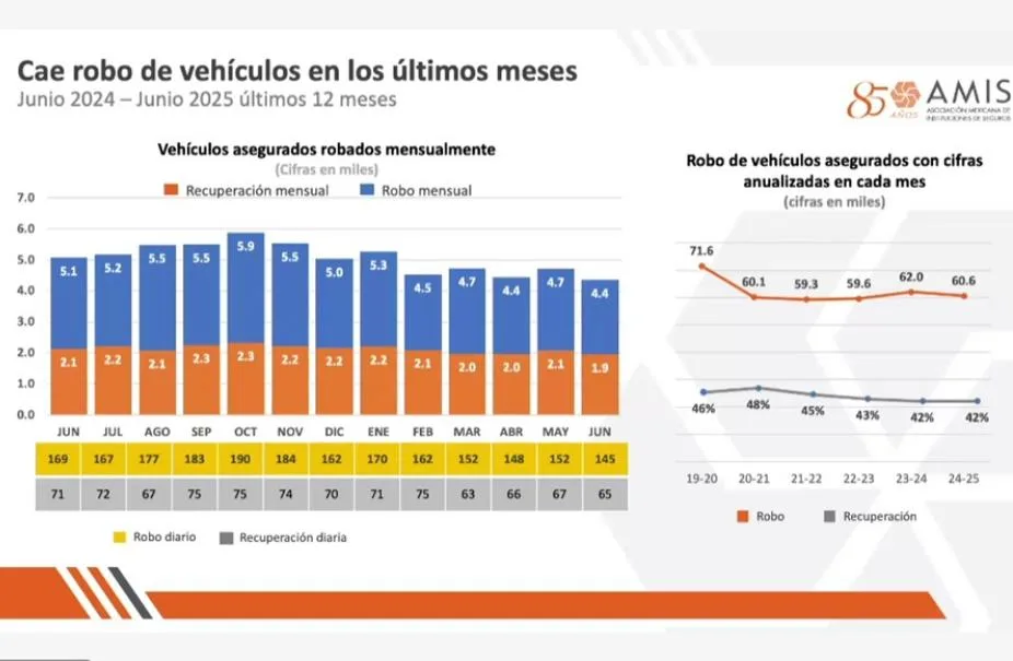 El hurto de unidades cae 2.2% anual en junio del 2025, informó la AMIS.