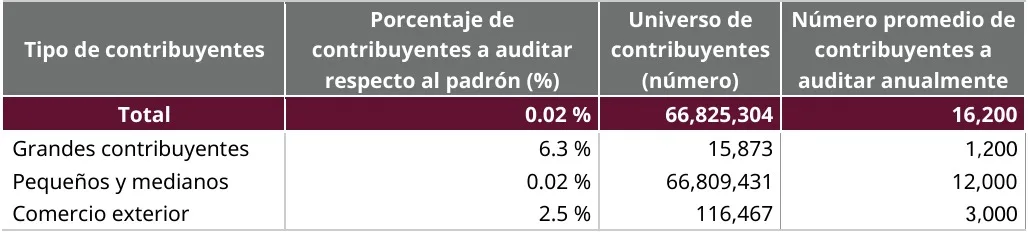El SAT detalló que la programación de auditorías se basa en el nivel de riesgo detectado en cada contribuyente. El padrón auditable se distribuye de la siguiente manera:
