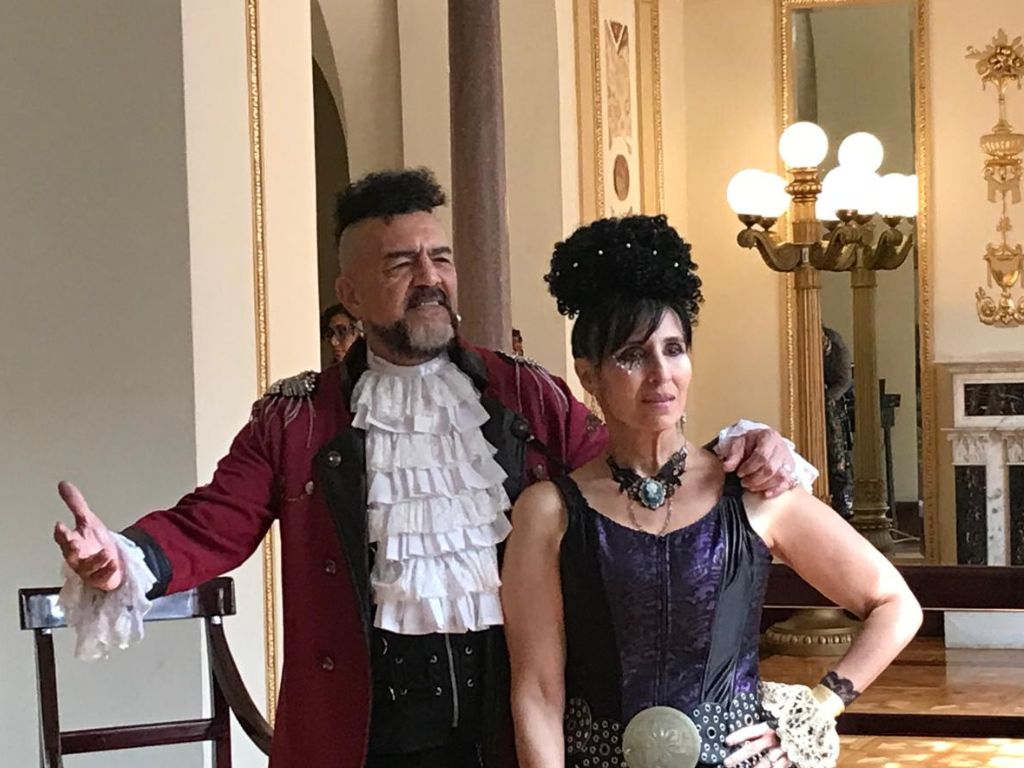 Sergio Arau y Yareli Arizmendi posan caracterizados en el Teatro de la Ciudad Esperanza Iris durante la presentación de su espectáculo “Tocada y Fuga”.