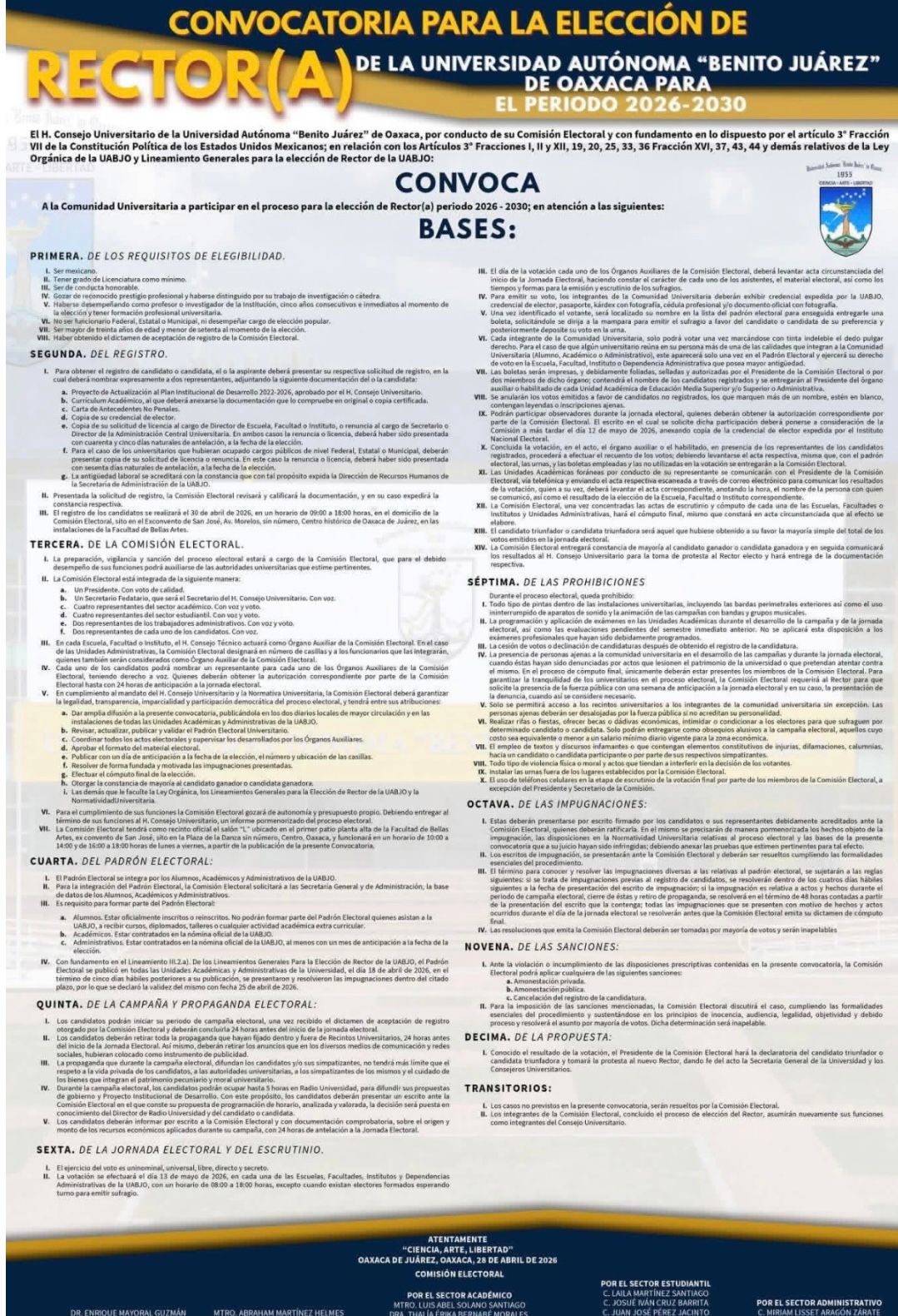 La Comisión Electoral emite la convocatoria con fundamento en la Ley Orgánica de la UABJO y los Lineamientos Generales para la Elección de Rector.