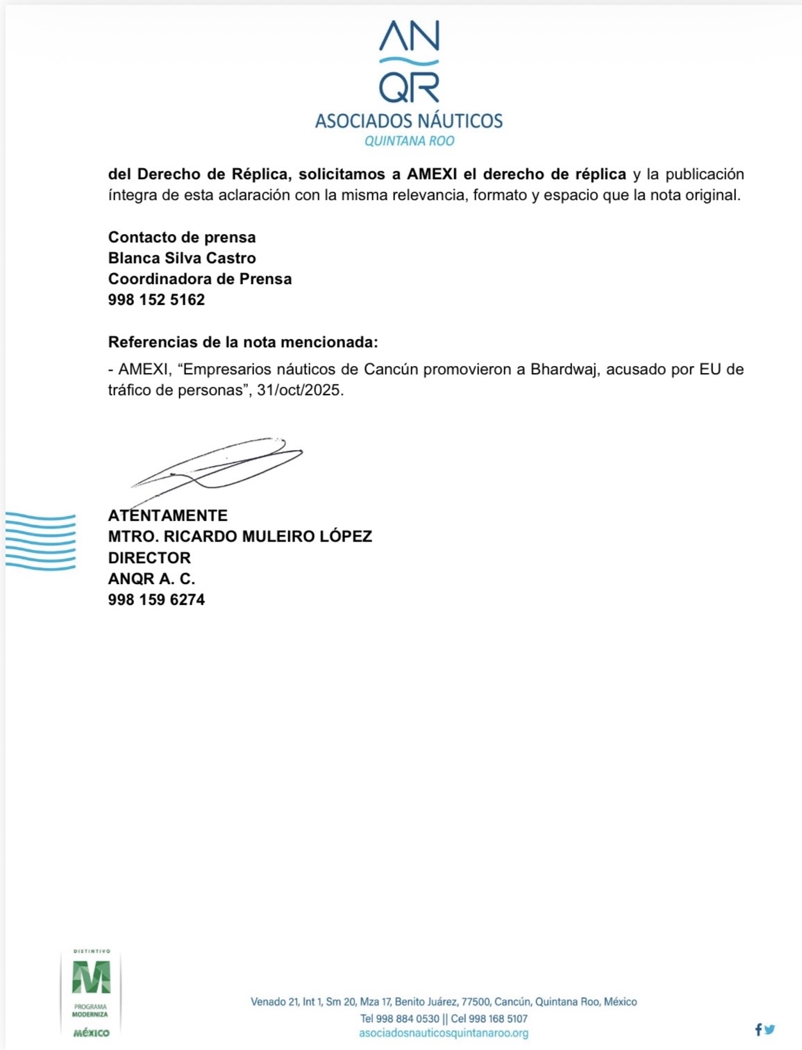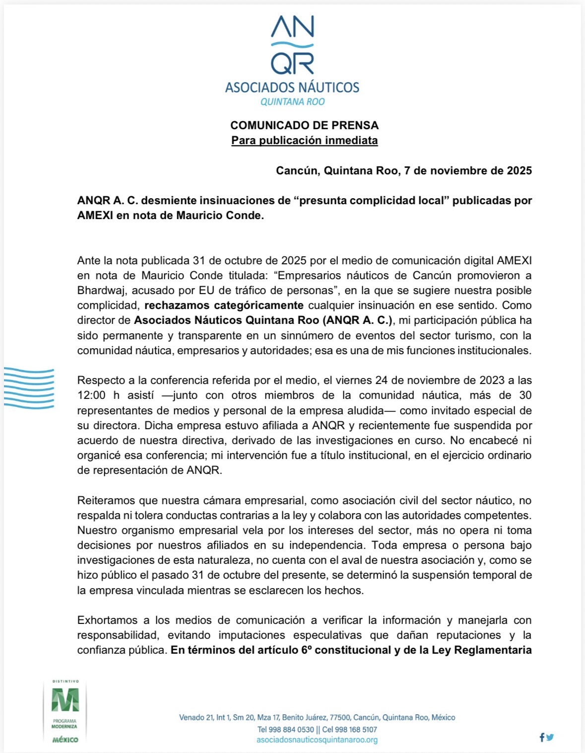 En relación al comunicado del Departamento del Tesoro de Estados Unidos que vincula a Vikrant Bhardwaj y su conglomerado VNV Group, como organización criminal internacional dedicada al tráfico de personas, el director de la Asociación de Náuticos de Quintana Roo, Ricardo Muleiro López, se deslindó de cualquier relación con este personaje.