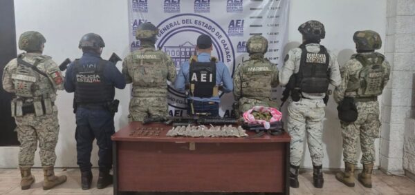 La Marina y fuerzas federales incautaron dos fusiles de asalto, un lanzagranadas y drogas diversas cerca de la región de la Costa de Oaxaca. Durante un patrullaje, identificaron una motoneta que circulaba a alta velocidad y abandonó un paquete grande. Dentro del paquete hallaron el armamento desarmado y al menos 50 bolsitas con drogas.