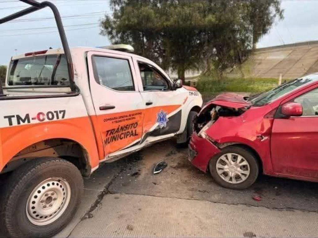 De acuerdo con los primeros reportes, el percance dejó daños visibles en ambas unidades: la parte frontal del automóvil rojo y el costado de la patrulla marcada con el número TM-C017 de Tránsito Municipal.