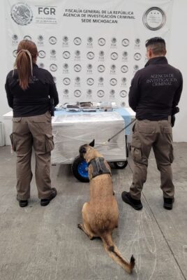 Agentes de seguridad, apoyados con un binomio canino, hallaron droga en una empresa de paquetería en Michoacán. AMEXI/Foto: Redes SocialesAgentes de seguridad federales y locales, con la ayuda de un binomio canino, aseguraron cuatro kilos 850 gramos de cocaína distribuida en cinco envoltorios confeccionados con plástico, y ocultos en un carrito de caja refrigerada de helados.