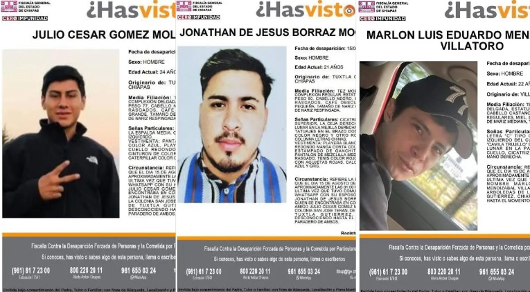 Los desaparecidos responden a los nombres de Jonathan de Jesús Borraz Moguel, Julio César Gómez Molina y Marlon Luis Eduardo Mendizábal Villatoro.