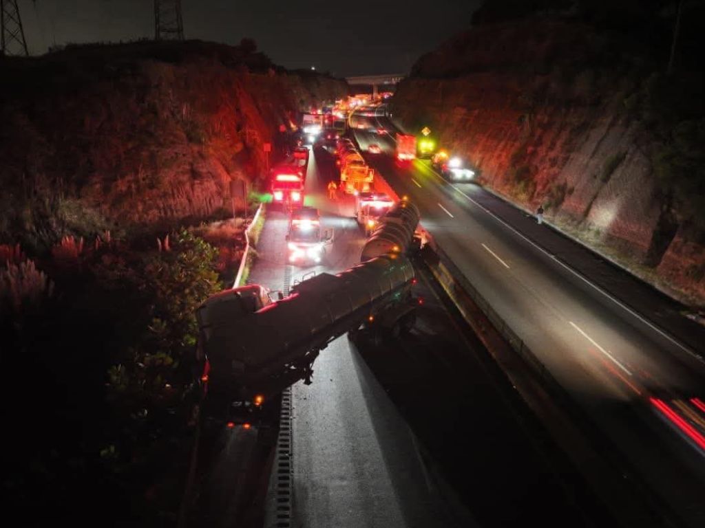 El tráiler, que transportaba aproximadamente 80 mil litros de turbosina, quedó atravesado en los carriles de circulación, imposibilitando el paso de los vehículos en la autopista.