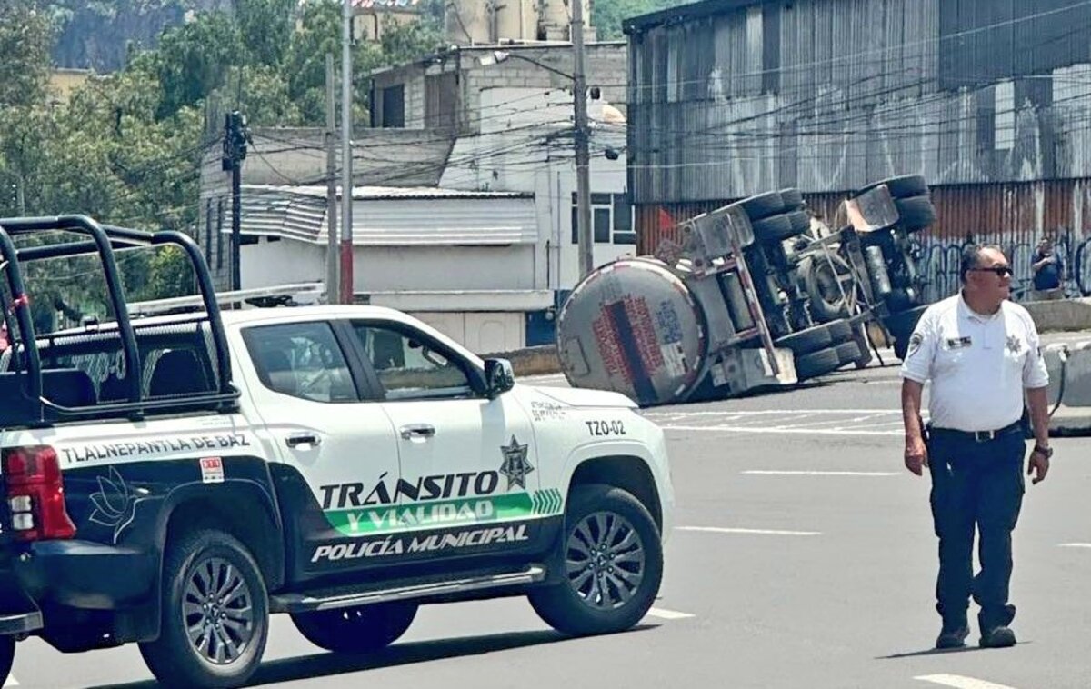 La pipa cisterna con capacidad para 64 mil litros de combustible se desenganchó del contenedor y volcó en los límites de Ecatepec con Tlalnepantla hacia la Ciudad de México, en el cruce de la vía Morelos y la autopista, en la desviación a Indios Verdes y Martín Carrera.
