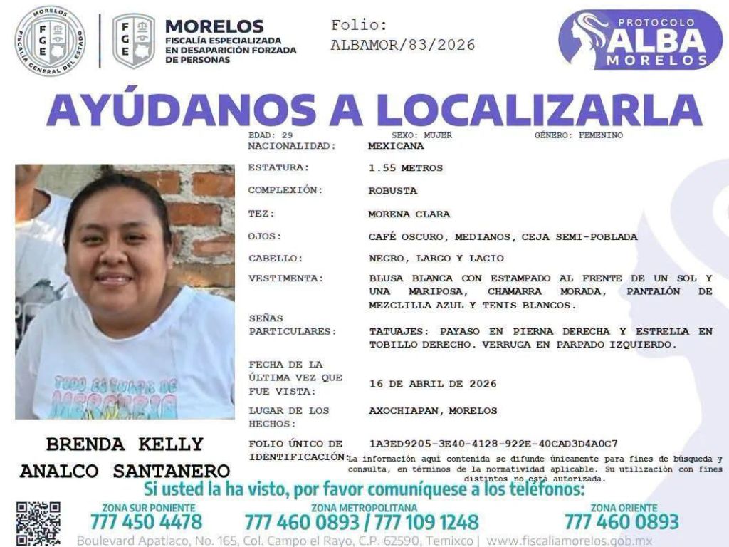Este martes se cumplen cinco días de la desaparición de Brenda Kelly Analco Santanero, de 29 años de edad, quien fue vista por última vez en el municipio de Axochiapan, al oriente del estado de Morelos.