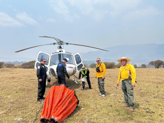 La dependencia resaltó que, como parte de las acciones, participa activamente un helicóptero con helibalde del Servicio Aéreo de la SSP, con lo que se lograron ocho descargas de agua en más de una hora de vuelo acumulado.