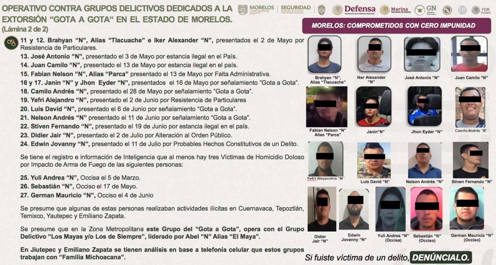 Un grupo de 24 colombianos que residían en Morelos fue arrestado y deportado a su país por su participación en extorsiones bajo la modalidad de “gota a gota” y otras actividades criminales organizadas en las que también están implicadas personas de nacionalidad venezolana.
