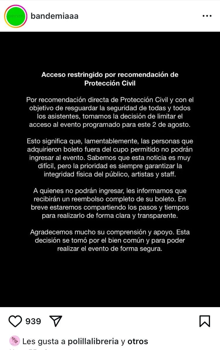En este sentido, el municipio exhortó a las empresas organizadoras de espectáculos masivos a respetar los protocolos y requisitos legales para evitar poner en riesgo a la población.