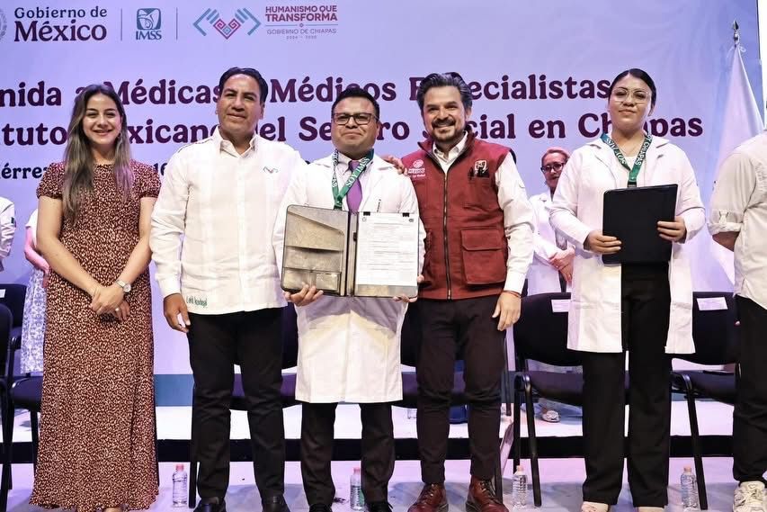 El gobernador Eduardo Ramírez Aguilar, y el director general del IMSS, Zoé Robledo, dieron la bienvenida a los galenos en el Teatro Universitario de la Universidad de Chiapas (Unicach) realizaron la entrega simbólica de 10 nombramientos a médicas y médicos especialistas.