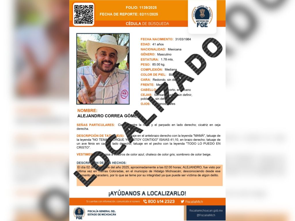Este jueves, la Fiscalía General del Estado de Michoacán dio a conocer que se localizó con vida al expresidente municipal de Zinapécuaro, Alejandro Correa Gómez, quien estaba desaparecido desde el pasado 2 de noviembre.