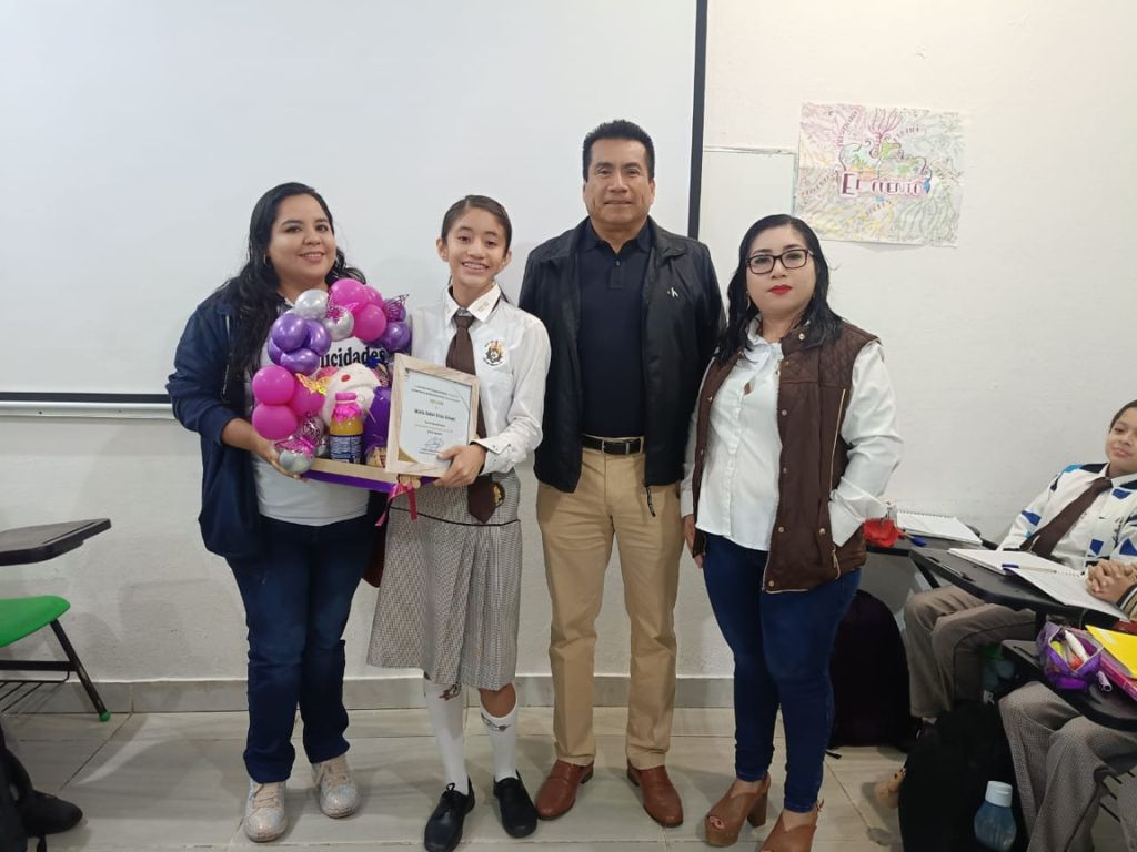 Paula Rodríguez López, directora de la primaria Justo Sierra Méndez, encabezó la entrega. La acompañó la maestra Delia Lilibeth Sánchez Hernández, quien guio la formación académica de la estudiante durante su etapa en educación primaria.