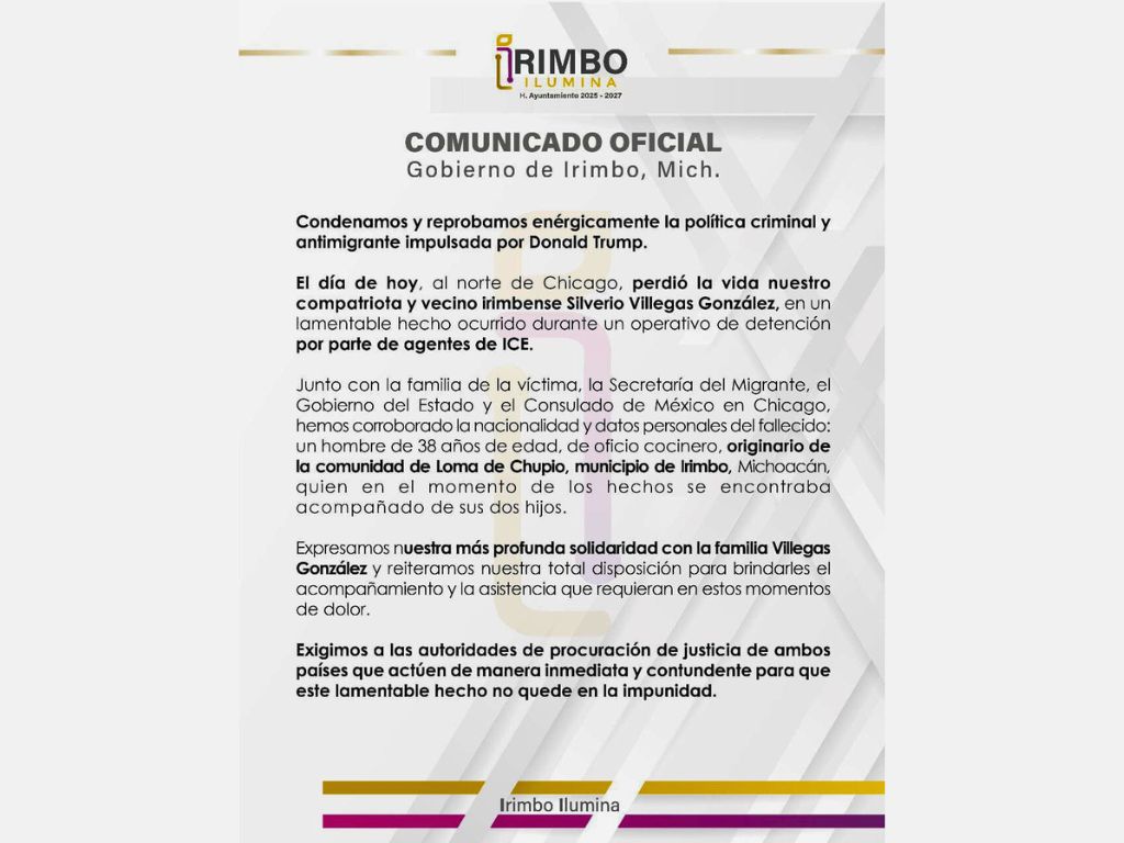 El Ayuntamiento de Irimbo emitió un comunicado condenando las políticas antimigrantes del gobierno estadounidense. También exigió justicia para su paisano fallecido.