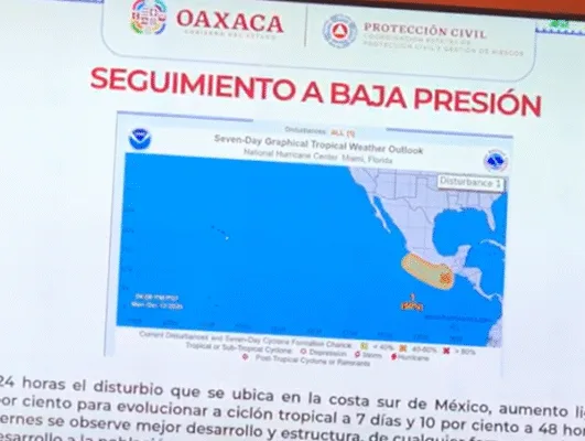 El titular de la dependencia, Manuel Maza Sanchez, explicó que el fenómeno natural es un sistema de baja presión con potencial de desarrollo ciclónico que este fin de semana podría impactar las costas del istmo Tehuantepec, para después tocar tierra.