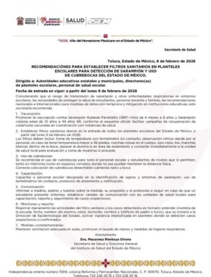 Ante el riesgo de transmisión de sarampión y otras enfermedades respiratorias en espacios escolares, la Secretaría de Salud del Estado de México dispuso la instalación obligatoria de filtros sanitarios diarios en todos los planteles de la entidad, medida que entrará en vigor a partir del lunes 9 de febrero de 2026.