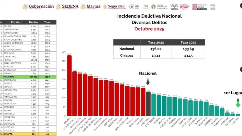 El mandatario chiapaneco destacó que, de nueva cuenta, en la incidencia delictiva nacional, el estado se ubicó en primer lugar en disminución de diversos delitos y en segundo lugar en delitos de alto impacto.