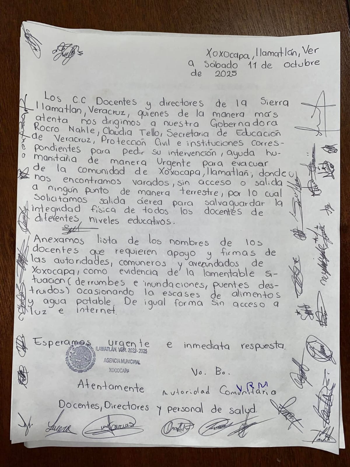 Los maestros atrapados en Xoxocapa solicitan la activación de un puente aéreo desde Huejutla o Tantoyuca, y el envío de helicópteros con personal de rescate, alimentos, medicamentos y equipos de comunicación. La carta, firmada por más de 30 docentes, fue difundida en redes sociales y entregada a autoridades locales.