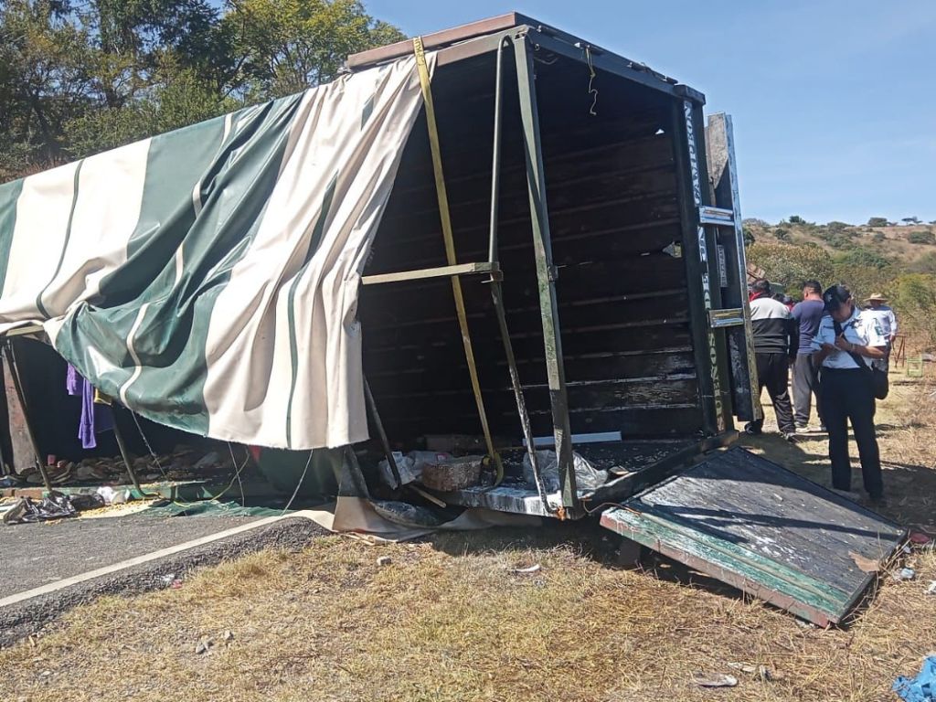 Dos hombres lesionados y cuantiosos daños materiales es el saldo de la volcadura de un camión en San Pablo Huitzo, Oaxaca, en el que viajaban peregrinos de San Salvador Huixcolotla, Puebla.