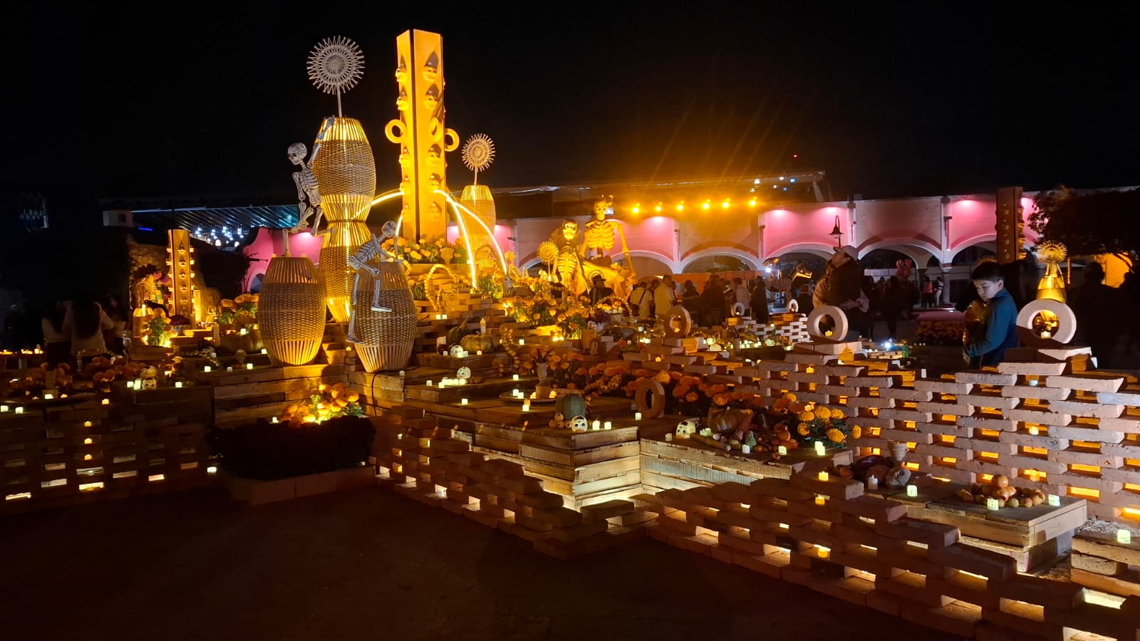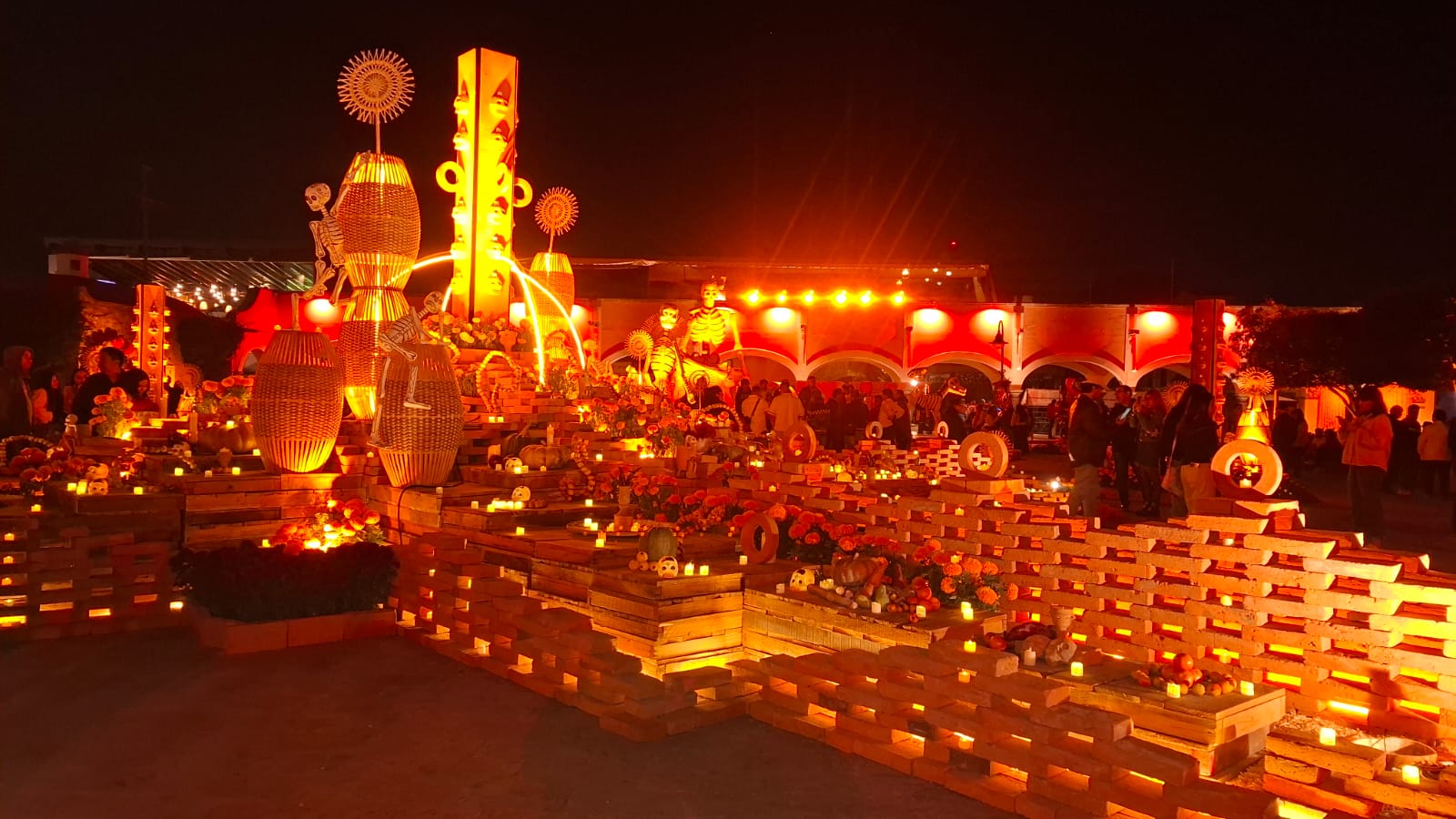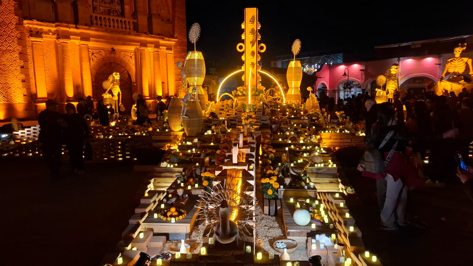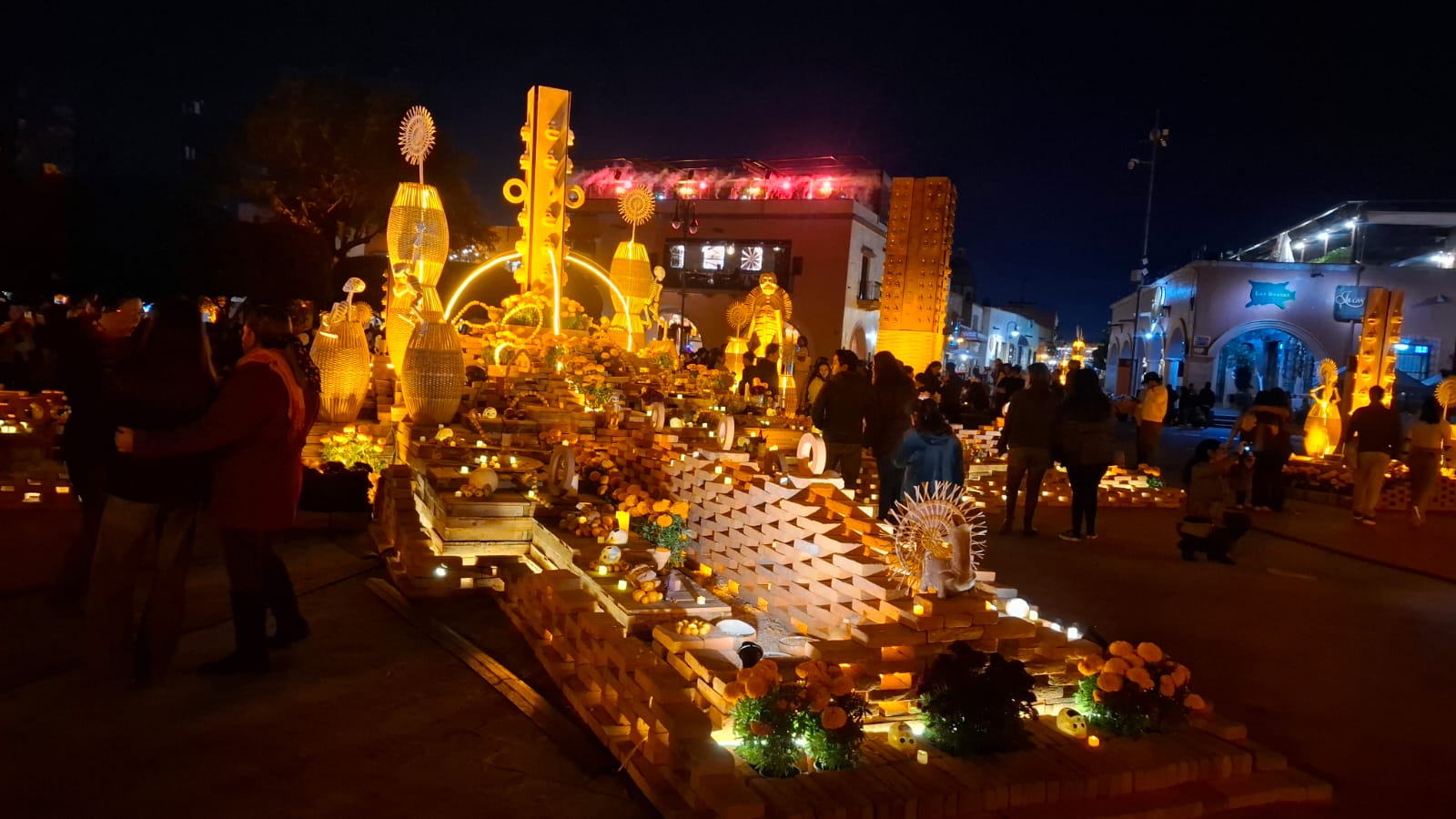 En la Plaza Miguel Hidalgo los artesanos instalaron un Altar Monumental, además de un pabellón donde se ofrecen productos de los viñedos de la región, mientras que en sus calles cercanas colocaron tapetes alusivos a las festividades del 1 y 2 de noviembre.
