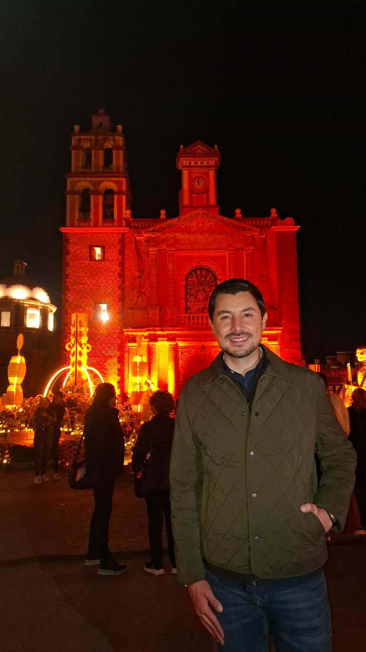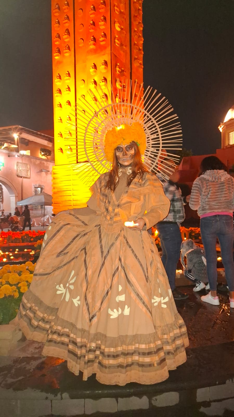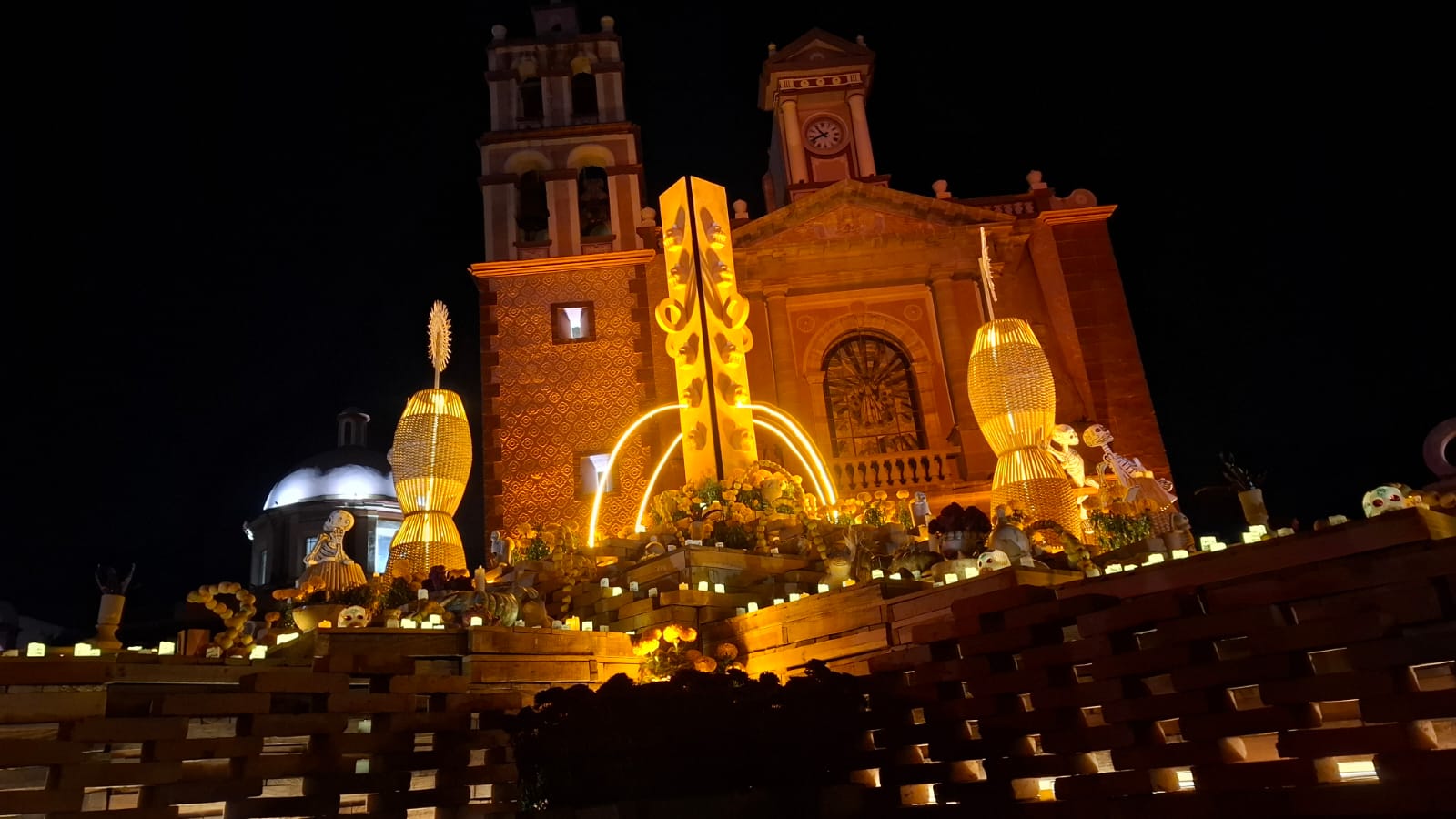 Comerciantes y artesanos del pueblo mágico de Tequisquiapan, en Querétaro, instalaron el Altar Monumental en la plaza central, para celebrar el Día de Muertos, como parte del Festival «Tejedores de luz».