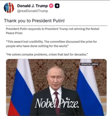 Desde Tajikistán, donde hacía una visita oficial, el presidente ruso Vladimir Putin dijo que “nadie puede negar que, a veces, las personas que no hicieron NADA por la paz reciben el premio”, cuya importancia “se ha erosionado.”