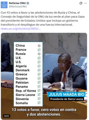 El Consejo de Seguridad de las Naciones Unidas aprobó, por 13 votos a favor y las abstenciones de Rusia y China, una resolución que respalda el plan de paz para la Franja de Gaza y pretende consolidar el alto el fuego vigente desde octubre, para lo cual autorizó el despliegue de una Fuerza Internacional de Estabilización en ese territorio palestino hasta diciembre de 2027.