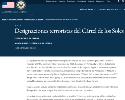En Washington, el Departamento de Estado publicó la designación del Cártel de los Soles (Venezuela) como organización terrorista. AMEXI/Foto: Captura de pantalla