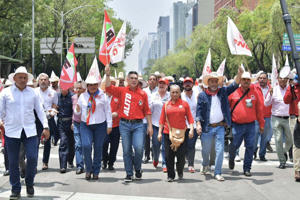 Con el puño en alto, el dirigente nacional del PRI, Alejandro Moreno Cárdenas, se sumó a simpatizantes y militantes que marcharon en su apoyo sobre Avenida Reforma, luego del su altercado con el morenista Gerardo Fernández Noroña.